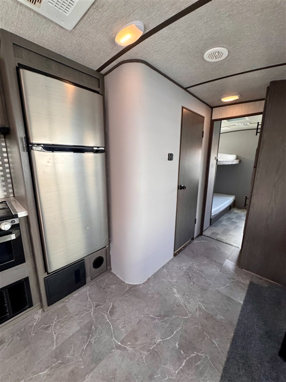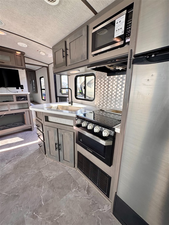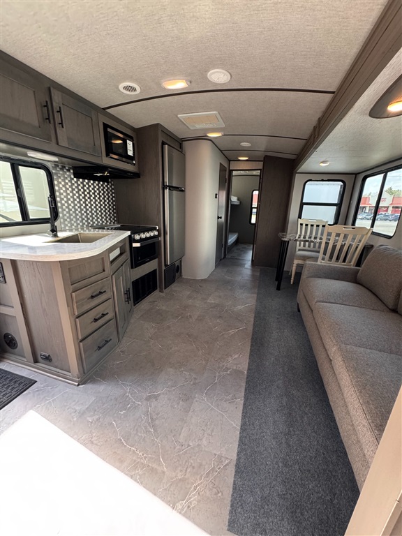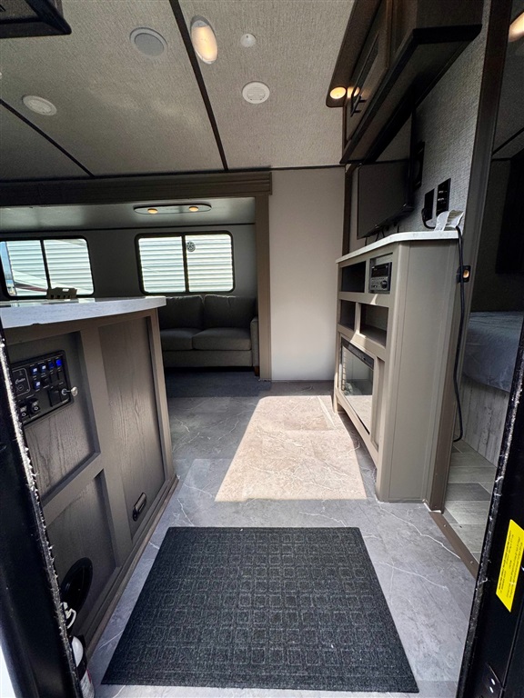 The 2020 Cruiser RV Embrace EL310 is a 36-foot ultra-lite travel trailer designed for large families, featuring a dual-slide floor plan that can sleep up to nine people. This model is notable for its private rear bunkhouse and a master bedroom equipped with a queen size bed