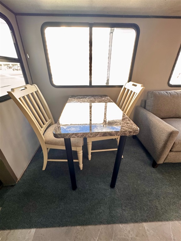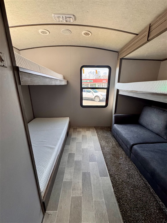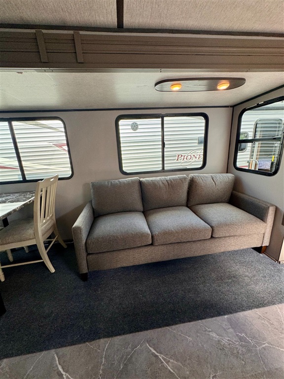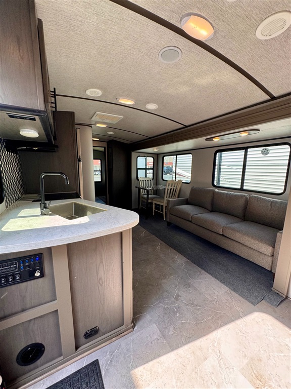 The interior is designed with a "home away from home" feel, featuring vaulted ceilings