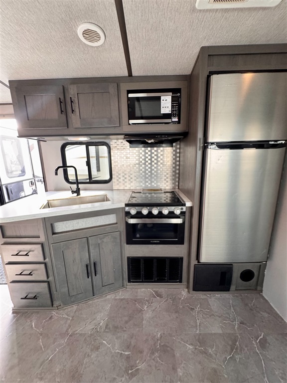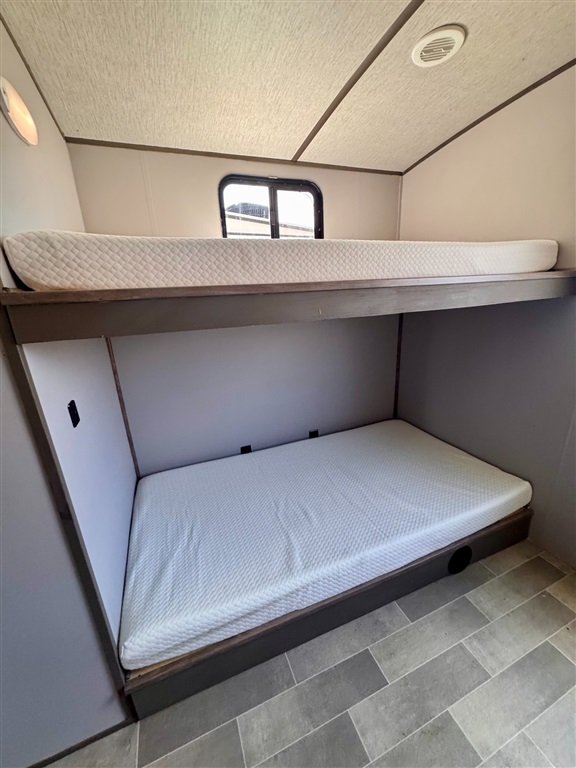 Fresh water 44 gallons, with both gray and black water tanks holding 30 gallons Equipped with a 15,000 BTU air conditioner and a 30,000 BTU heater.