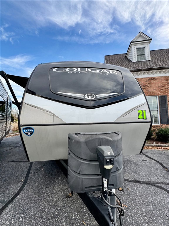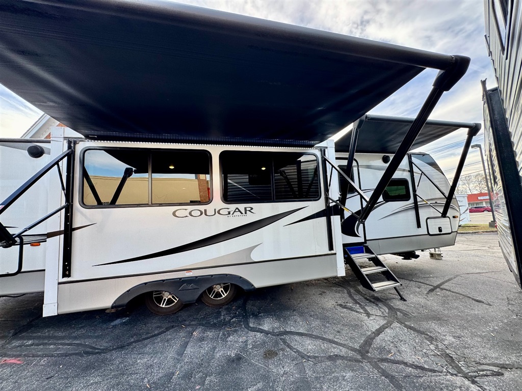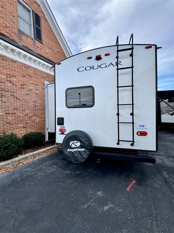 The 2021 Keystone Cougar 34TSB is a 37-foot, triple-slide travel trailer from Keystone's "Cougar Half-Ton" line, designed to sleep 8 people. Key features include a separate bunkhouse, a large king bed in the master bedroom, a fully equipped kitchen, and an outdoor kitchen. It is built for four-season camping with features like the Climate Guard package and a heated, enclosed underbelly.