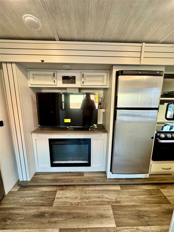 New Smart TV, and an electric fireplace.