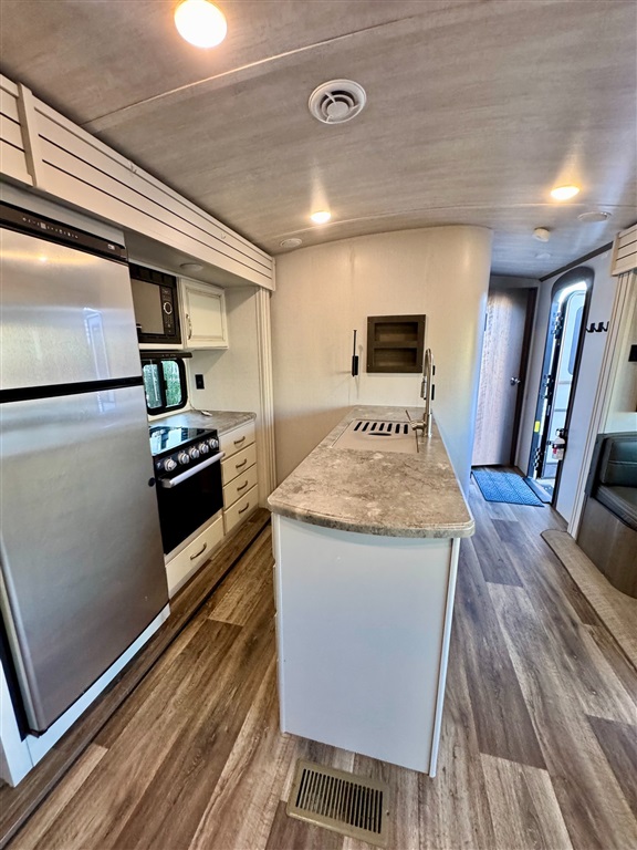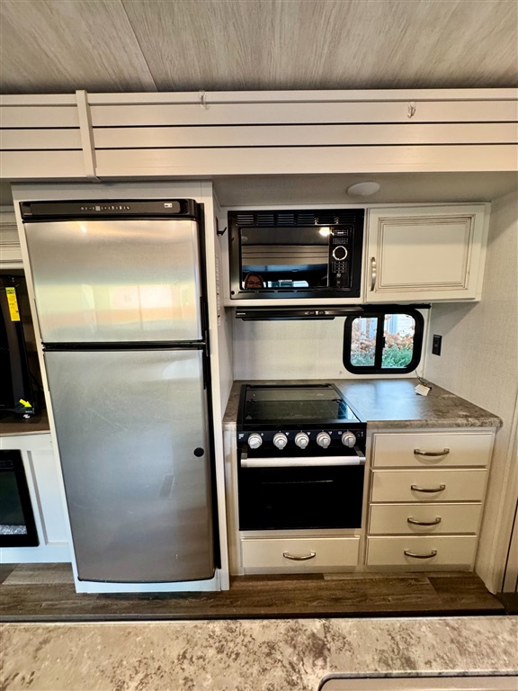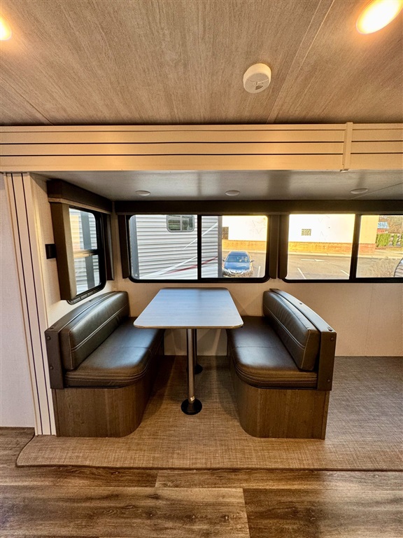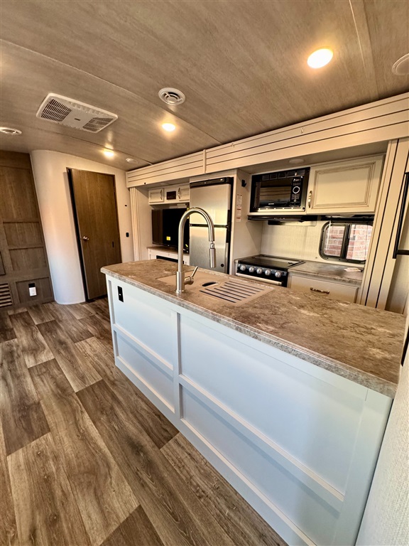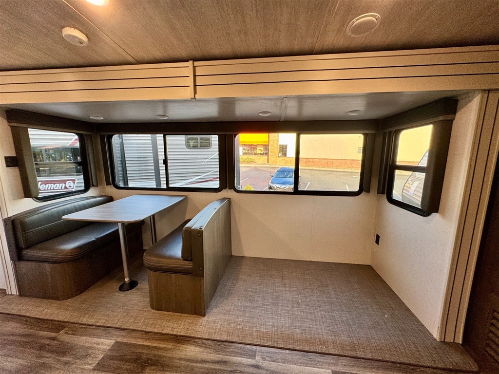 Kitchen: Includes a stainless steel refrigerator and freezer, three-burner stovetop, oven, island with farmhouse sinks, and a booth dinette with panoramic windows.