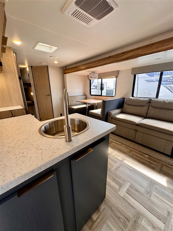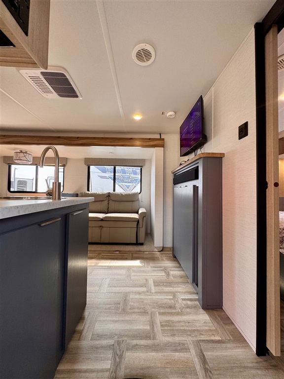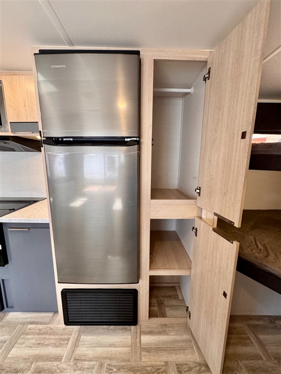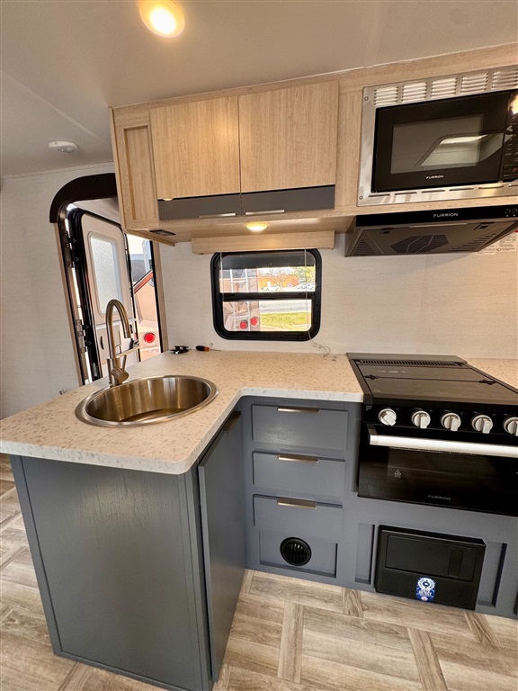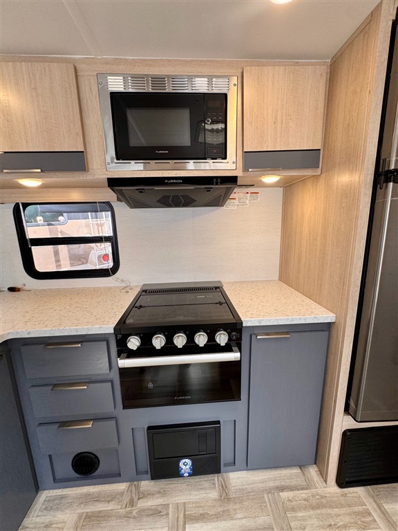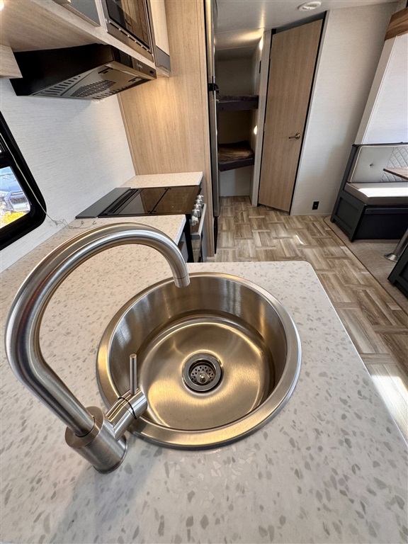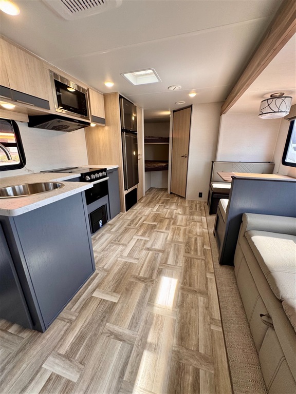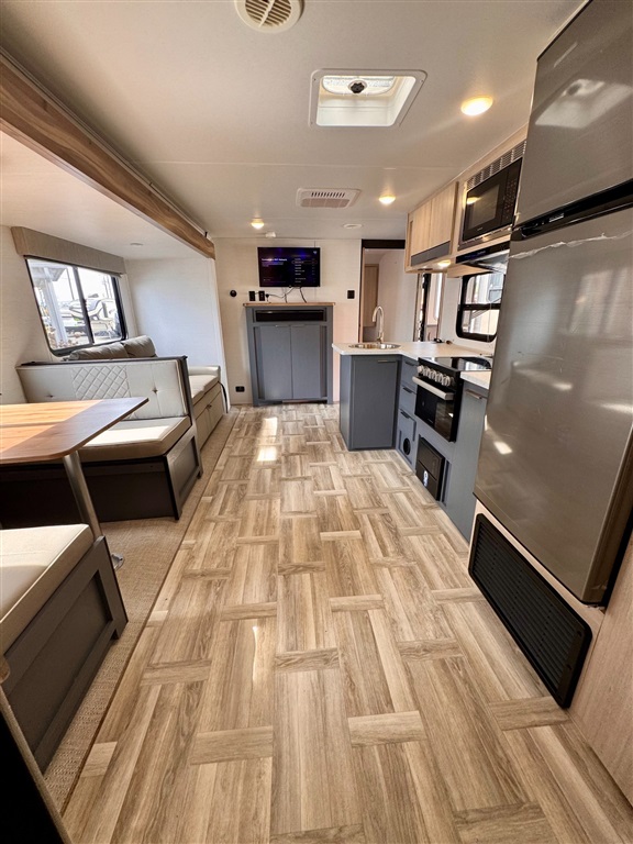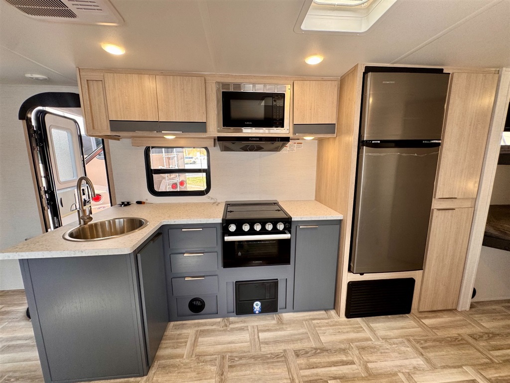Fully equipped kitchen with large 12V refrigerator, 3-burner cooktop, oven, microwave, and stainless-steel sink