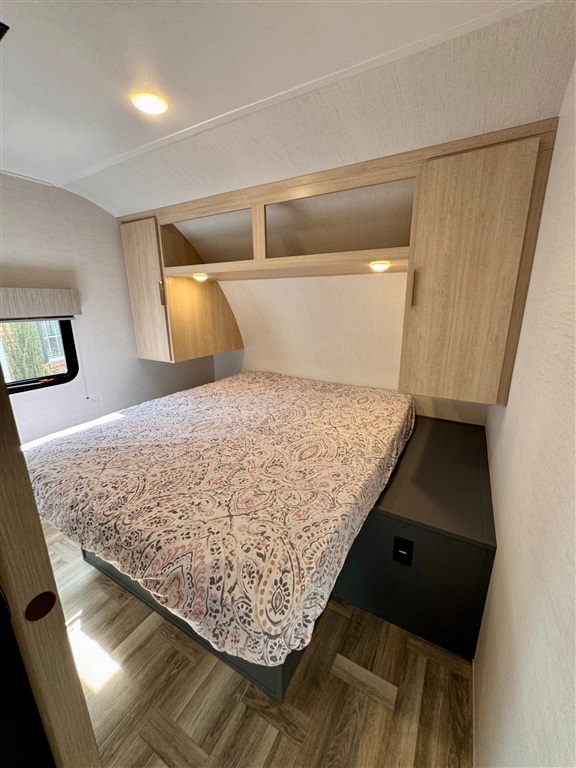 Private front queen bedroom with dual wardrobes and overhead storage