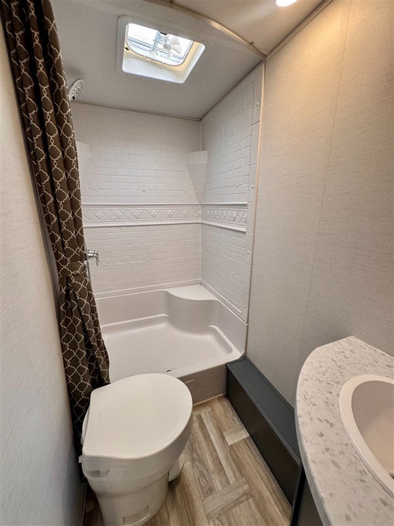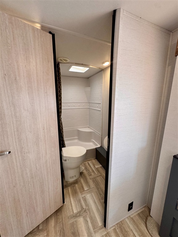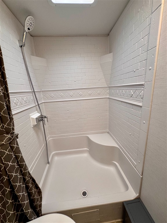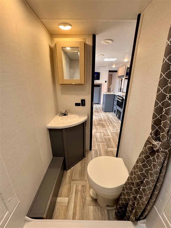 Full rear bathroom with shower (with seat), toilet, and vanity
