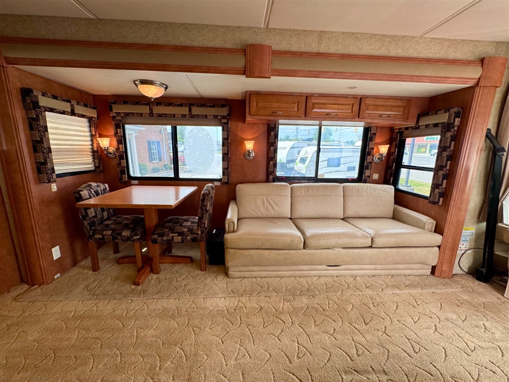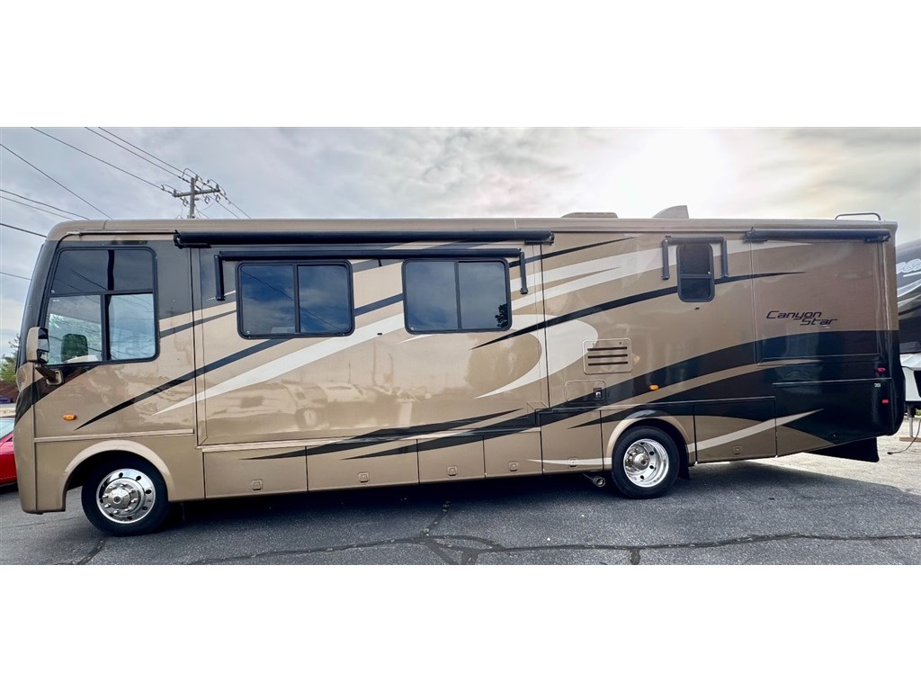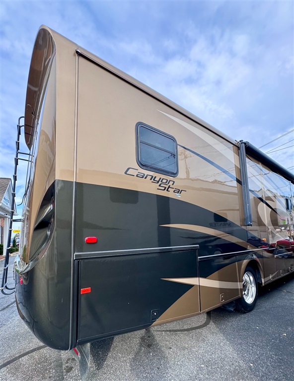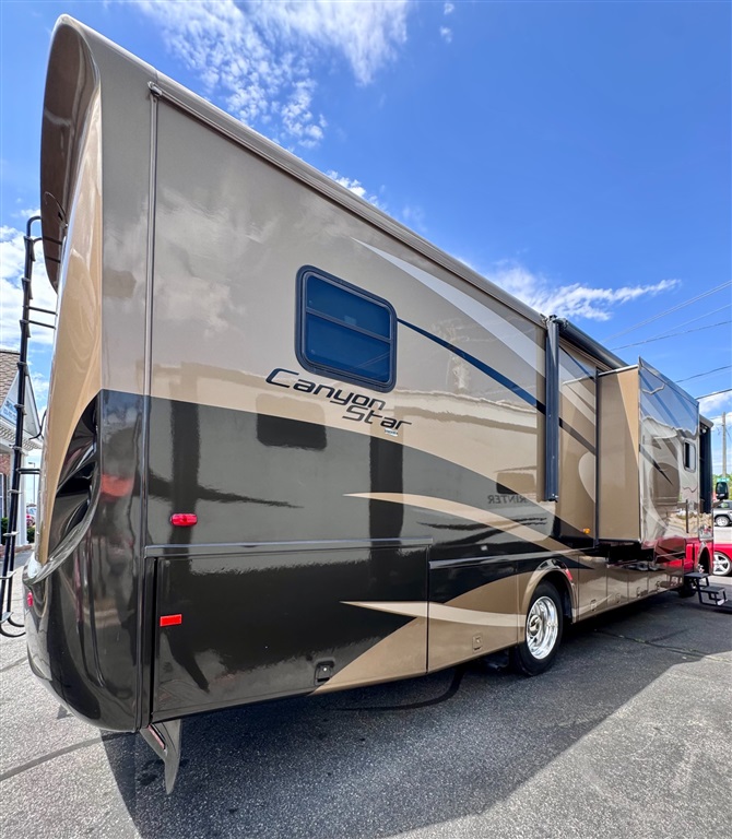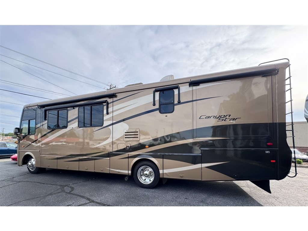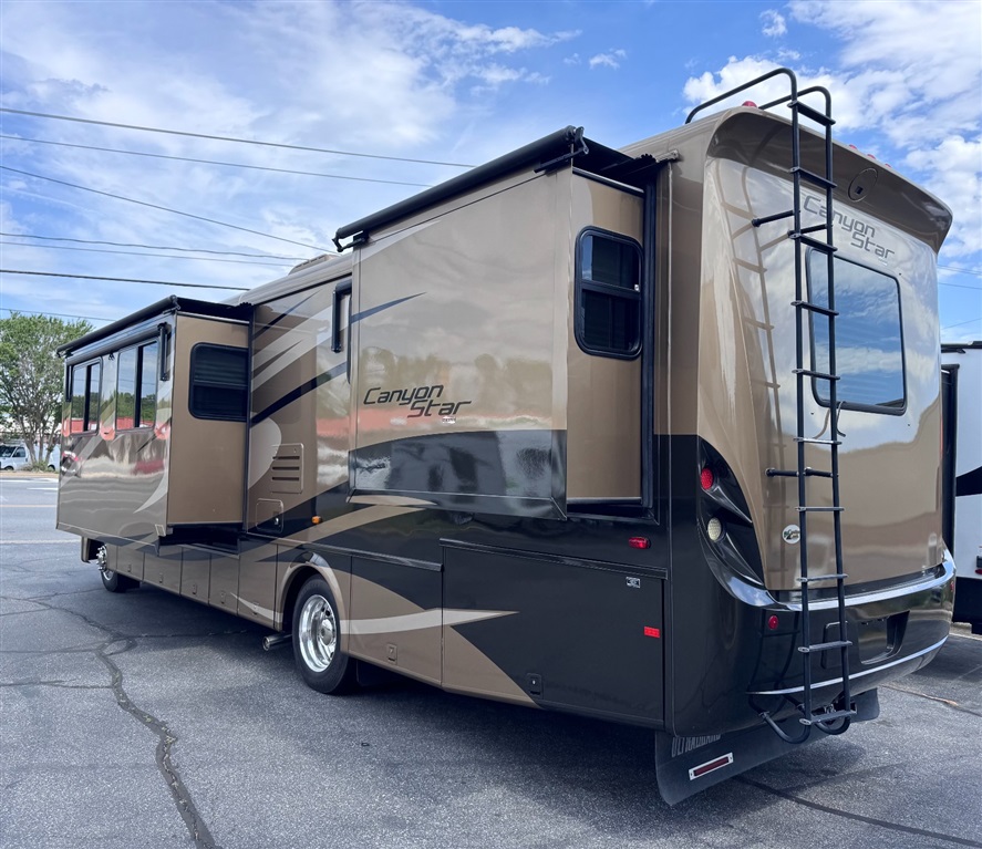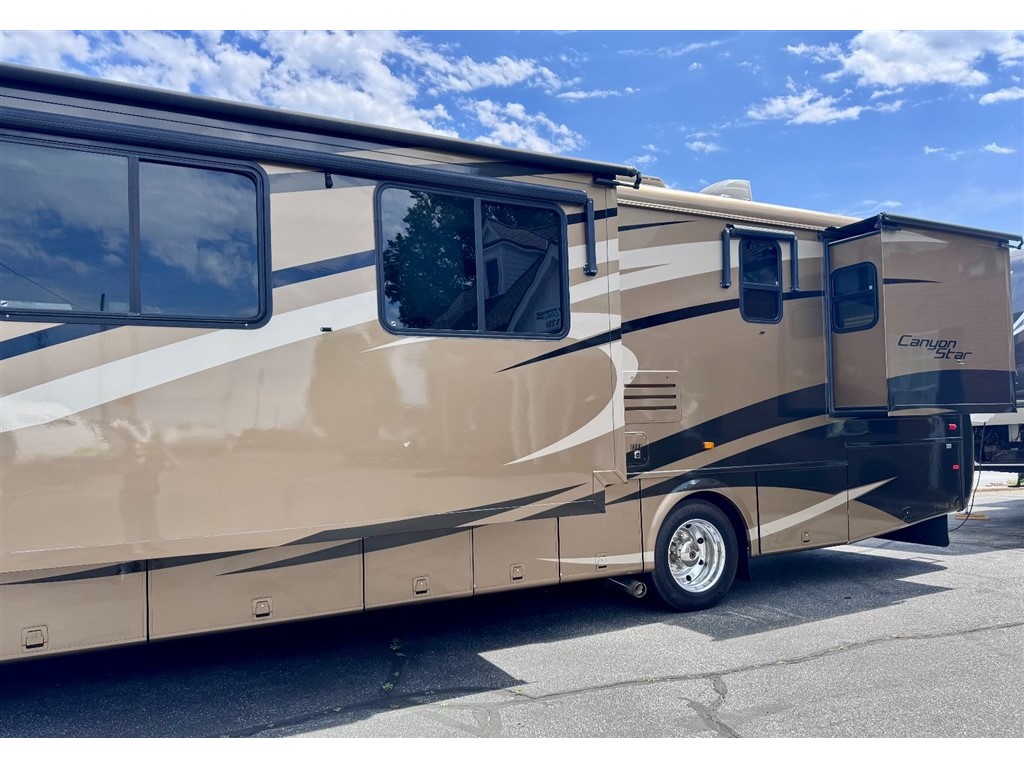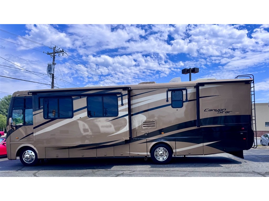 2009 Newmar Canyon Star 3641 is a 36-foot gasoline-powered Class A motorhome featuring three slide-outs and a side dinette floor plan. It is built on a heavy-duty Ford chassis designed for long-term comfort and durability.