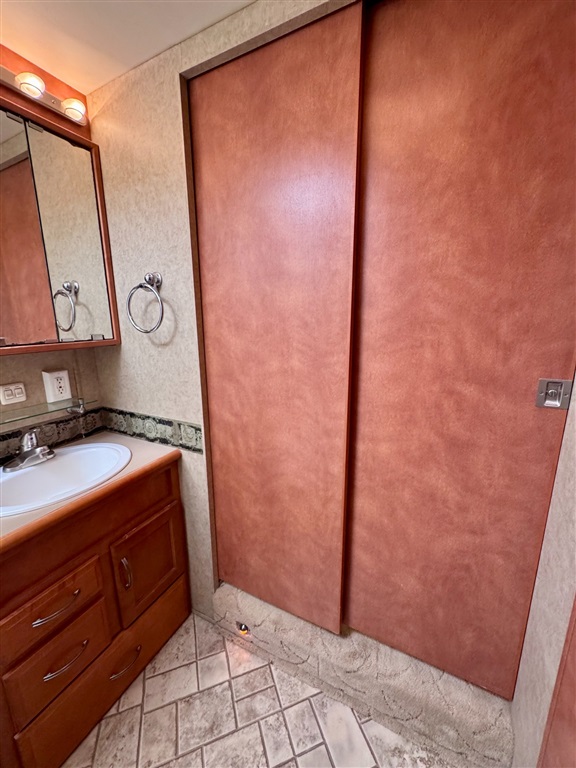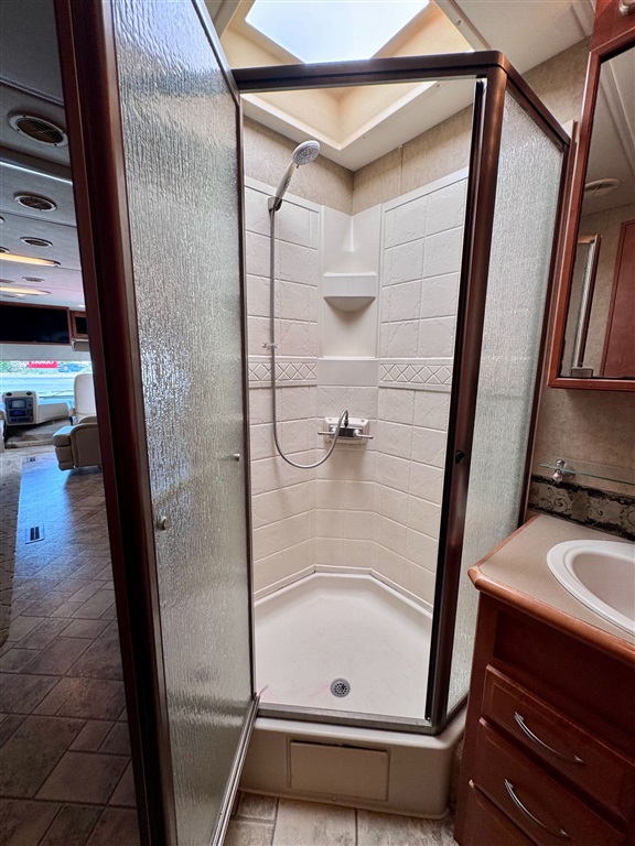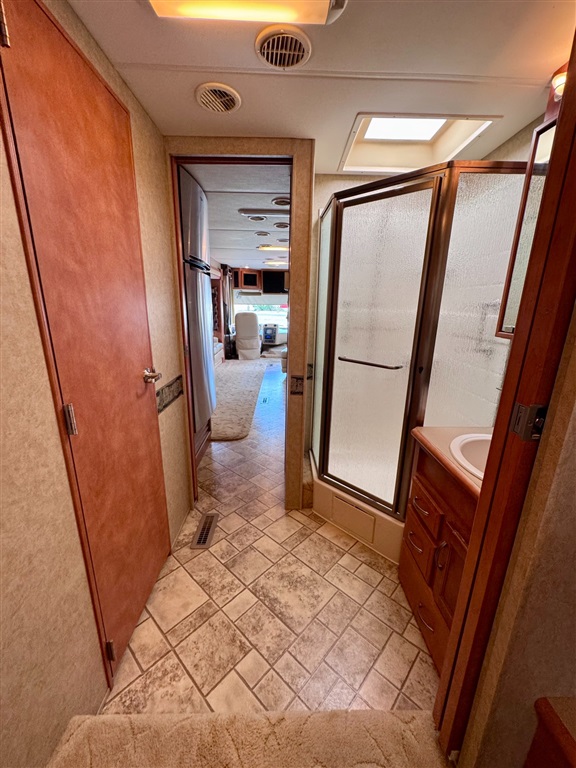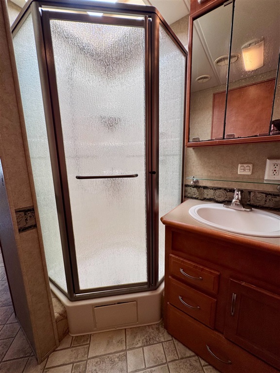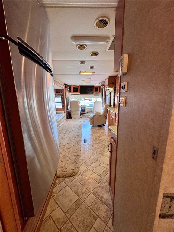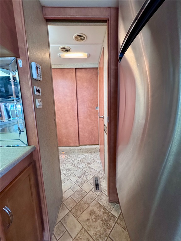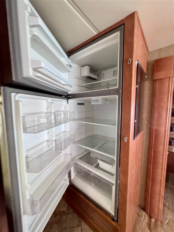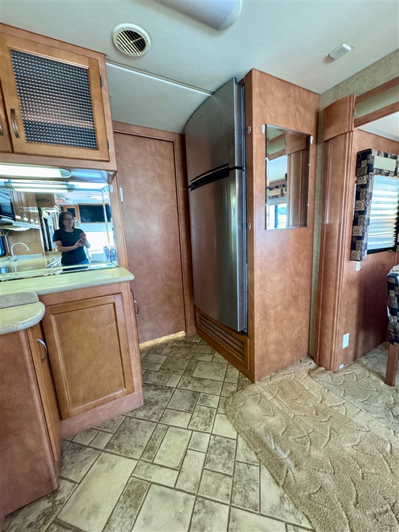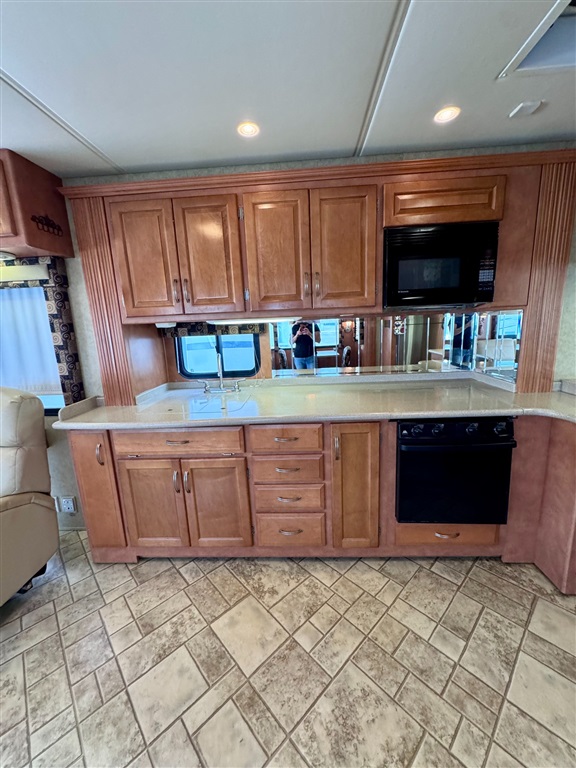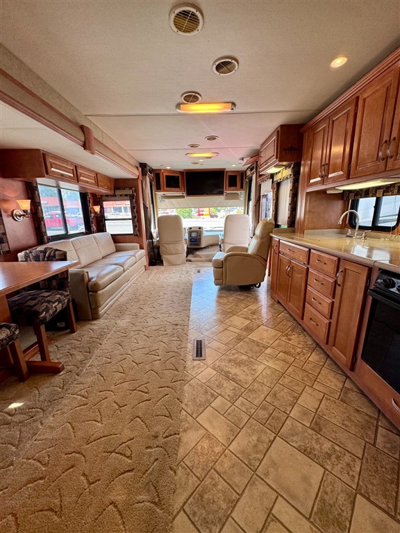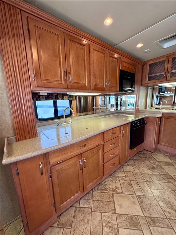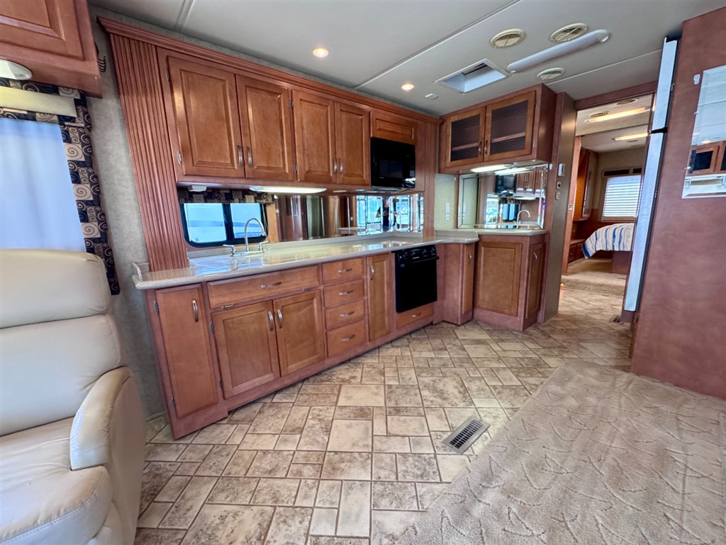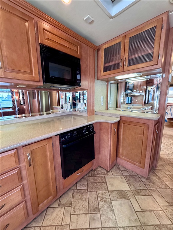 Kitchen: Includes a three-burner cooktop, convection microwave, 10 cu. ft. Norcold refrigerator.
